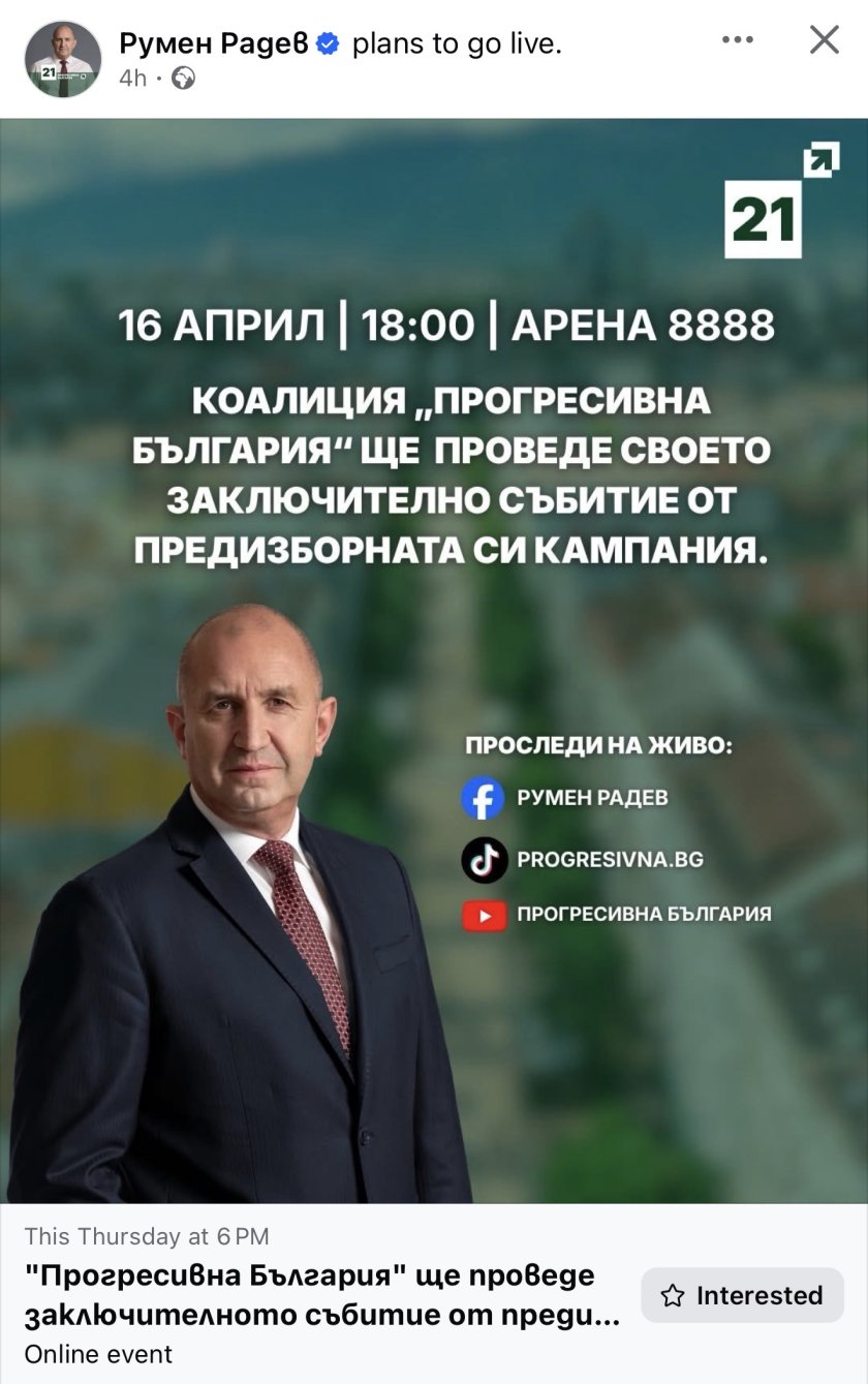 Коалиция „Прогресивна България“ ще проведе своето заключително събитие от предизборната си кампания на 16 април 2026 г. (четвъртък) от 18:00 ч. в Арена 8888 в София.