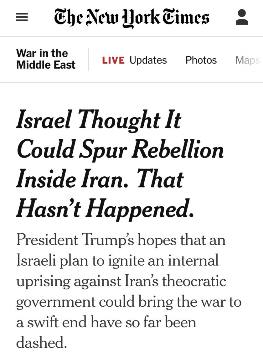 NYT отбеляза, че предположението, че Израел и САЩ могат да провокират масово въстание в Иран е ключова грешка в подготовката за военната им кампания. Вместо да „експлодира отвътре“, иранското правителство се засили. Техеран започна да нанася ответни удари срещу военни бази, градове и кораби в Персийския залив. Атакувани бяха и уязвими нефтени и газови съоръжения, се казва в статията.