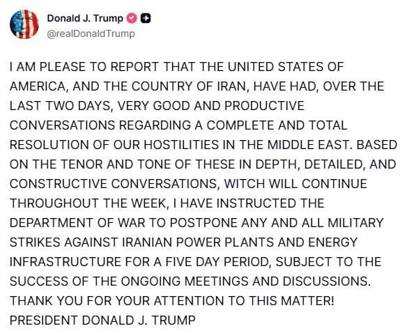 “Имам удоволствието да съобщя, че Съединените американски щати и държавата Иран проведоха през последните два дни много добри и продуктивни разговори относно пълното и цялостно разрешаване на нашите враждебни действия в Близкия изток. Въз основа на характера и тона на тези задълбочени, подробни и конструктивни разговори, които ще продължат през цялата седмица, инструктирах Министерството на войната да отложи всички военни удари срещу иранските електроцентрали и енергийна инфраструктура за период от пет дни, в зависимост от успеха на текущите срещи и дискусии.