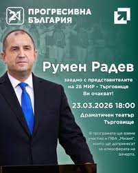 По-късно през деня, в 18:00 ч., Радев ще открие кампанията на „Прогресивна България“ в 28-и МИР Търговище. Събитието ще се проведе в Драматичния театър в града.