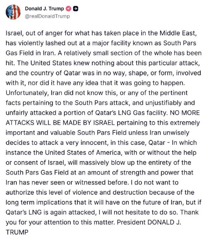 В този случай Съединените американски щати, със или без помощта или съгласието на Израел, ще взривят цялото газово находище „Южен Парс“ с такава сила и мощ, каквато Иран никога не е виждал или наблюдавал преди. Не искам да разрешавам това ниво на насилие и разрушения заради дългосрочните последици, които ще имат върху бъдещето на Иран, но ако катарският втечнен природен газ бъде атакуван отново, няма да се поколебая да го направя. Благодаря ви за вниманието към този въпрос. Президент ДОНАЛД Дж. ТРЪМП”.